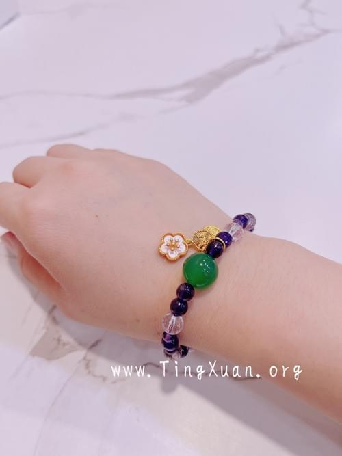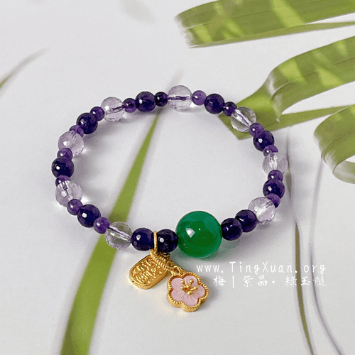 盛開的粉梅與象徵智慧與家庭和美的紫晶,搭配帶來貴人運的綠玉髓。